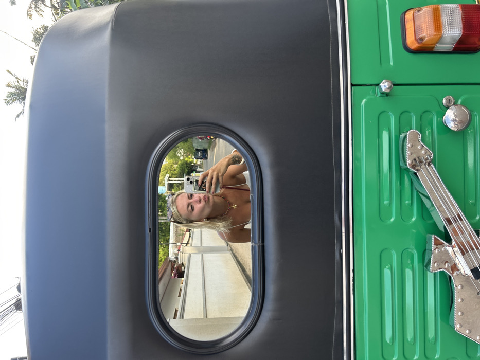 The image displays the rear exterior of a green and black tuk-tuk located in Mirissa, Sri Lanka. A blonde female is prominently reflected in the tuk-tuk's oval-shaped rear window, actively engaged in taking a selfie with a smartphone. She is seen puckering her lips, wearing a light-colored top, a gold-colored starfish necklace, and sunglasses resting on her head. A tattoo is visible on her right arm, which holds the smartphone. The tuk-tuk's lower body is a vibrant green, featuring a chrome, guitar-shaped embellishment affixed to the rear panel, adjacent to a partially visible multi-color rear light assembly on the right side. The upper canopy of the vehicle is black. The background, visible through the reflection, depicts a street or road bordered by light-colored, walled buildings with pillars, tropical vegetation including palm trees, and overhead utility lines, all under a bright sky.