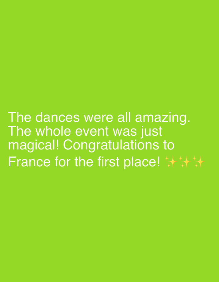 The image is a green background with white text. The text conveys excitement and congratulations. It begins by stating that the dances were amazing, followed by the whole event being magical. The text expresses congratulations to France for winning first place, ending with star emojis. The overall tone is celebratory and enthusiastic.