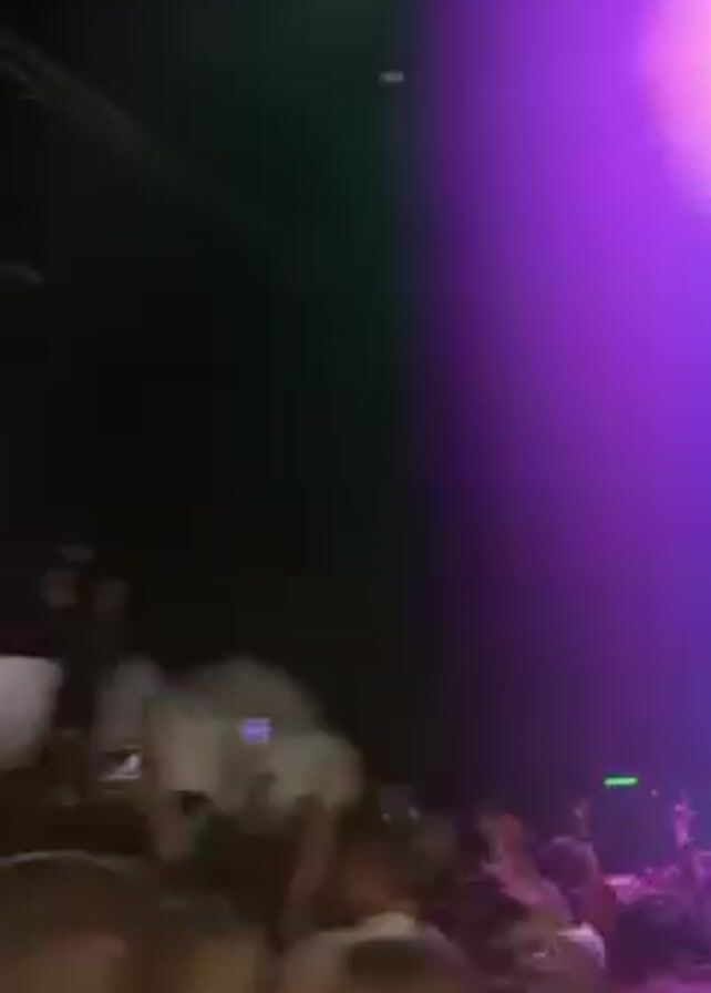 crowded dance floor at a music event. A DJ booth is set up on stage. There are bright spotlights and large white circular structures around the stage. People are dancing and raising their hands in the air. The camera moves around, showing different parts of the crowd and stage. The lighting changes, creating a vibrant atmosphere.