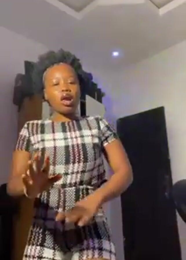 A young woman with dark, curly hair is standing indoors, dancing in front of a camera