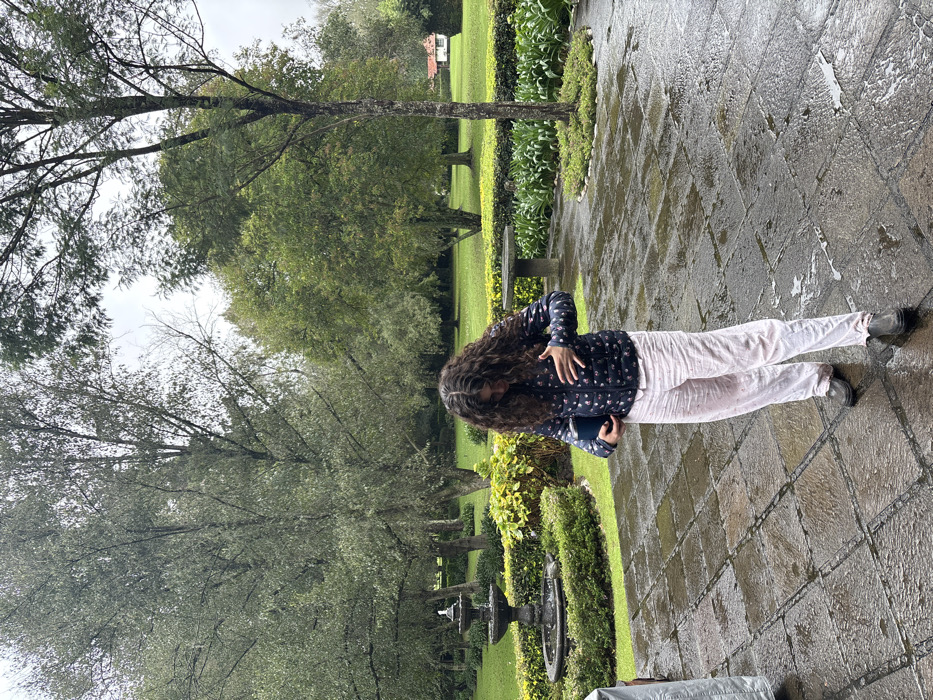 The image depicts a single individual standing on a wet, dark grey paved patio within a landscaped garden or estate, consistent with a location in Huasca de Ocampo, Mexico. The person, an adult with long, dark, curly hair, is positioned facing slightly away from the camera, looking downwards towards their midsection. They are wearing a dark blue puffer jacket with light-colored patterns, light-colored wide-leg trousers, and dark, possibly waterproof, shoes. Their left hand holds a dark blue book or notebook against their abdomen, while their right hand is positioned near their chest, seemingly adjusting the jacket or an item underneath. The environment is lush and green, indicating an outdoor setting. To the left of the individual, a multi-tiered dark stone fountain with flowing water is visible, surrounded by neatly trimmed green hedges. Further back, expansive green lawns are interspersed with numerous mature trees of varying sizes and species. In the middle-ground to the right, a circular stone table with a central pedestal is present. The far background to the right reveals a small, light-colored building with a distinctive reddish-orange tiled roof, partially obscured by trees. The sky is overcast, and the paved surface exhibits visible standing water and reflections, indicating recent or ongoing precipitation. A light-colored, covered object, possibly a vehicle or furniture, is partially visible on the far left edge of the frame.