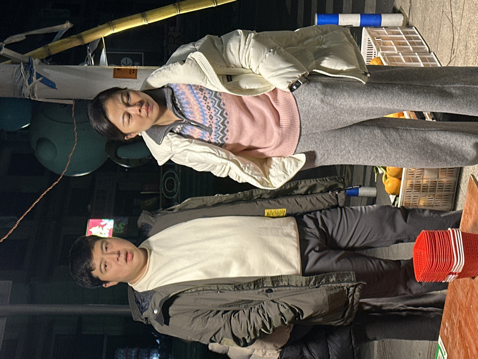 The image presents two individuals standing outdoors at night in Jiangjin, China