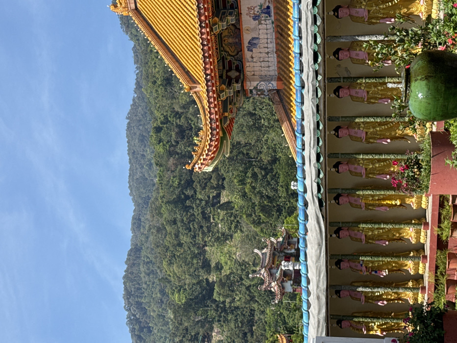 A vibrant temple scene captures intricate details of East Asian architecture against a backdrop of lush green mountains and a clear blue sky. A tiered, golden roof with elaborate ornamentation is visible. A wall features a row of small, golden statues adorned with pink, positioned beneath a blue-tiled overhang. A glossy, green vase sits atop a red surface, surrounded by foliage. The temple's construction harmonizes with the natural landscape.