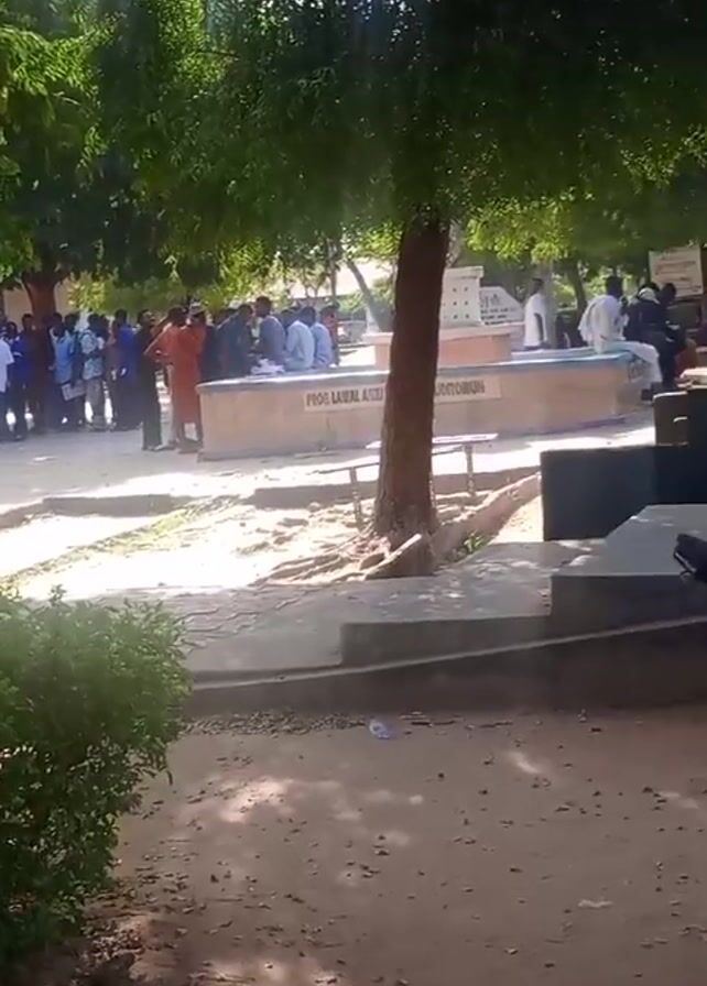 partially obscured view of an outdoor gathering of people, likely students, near a building labeled "Prof. Lawal Audi Auditorium". There are several trees providing shade over the area, with sunlight filtering through the leaves. A person is briefly seen sitting on a ledge in the foreground, looking at a phone. The overall impression is of a casual, possibly academic, environment.