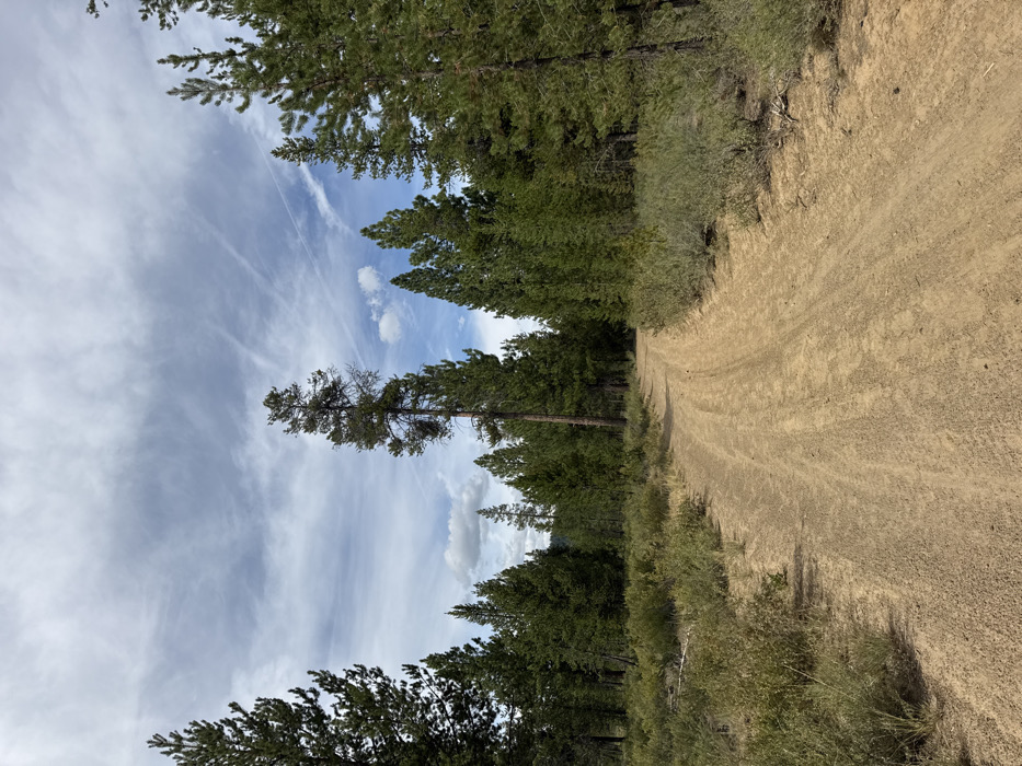 This image depicts a natural, unpopulated landscape within a forested area, consistent with terrain found near Three Rivers, United States. A light brown, unpaved dirt road with visible tire tracks extends from the foreground, curving gently towards the right and receding into the mid-ground. Dense coniferous trees, primarily pines, line both sides of the road, forming a thick forest. The undergrowth along the road's edges consists of various low-lying green and brownish-green shrubs and sparse dry grasses. The sky above is partially overcast with a mix of white and light grey clouds, revealing sections of blue sky. Faint, parallel contrails are present in the upper right quadrant of the sky. No individuals, animals, vehicles, or man-made structures are visible within the frame. The scene is illuminated by natural daylight.