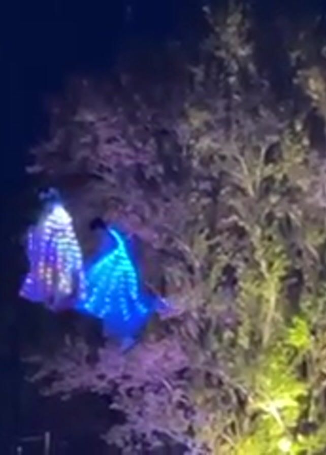 night-time scene with a large tree illuminated by colored lights. Two figures, possibly costumes or decorations, are suspended in the branches of the tree. One is predominantly white or light-colored, with multicolored lights, while the other is blue with bright, concentrated lights. The tree itself is also adorned with smaller, warm-toned lights. The background is a dark, almost black sky, with a faint structure visible to the left of the tree.