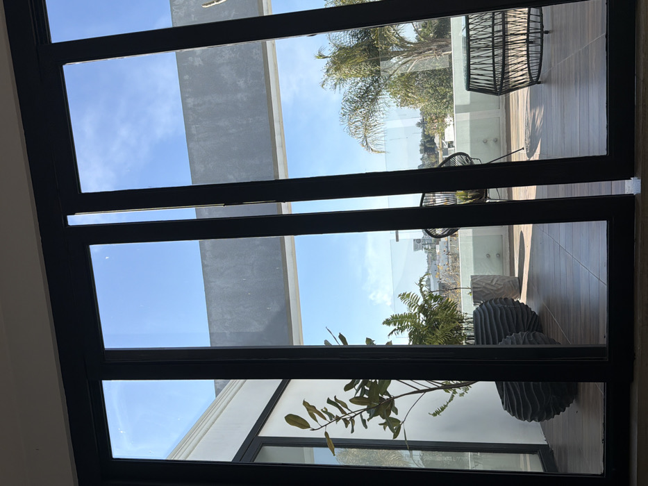A multi-paneled glass window reveals an outdoor terrace
