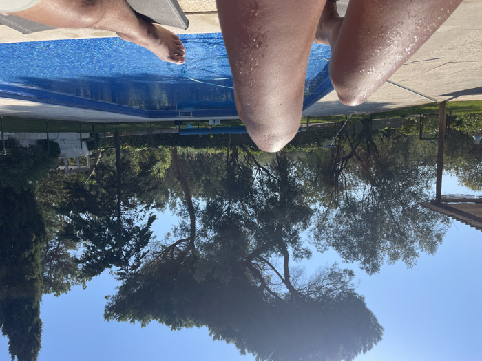 The image depicts an outdoor, sunlit poolside scene in Almada, Portugal. In the immediate foreground, the tanned lower extremities of two individuals are prominently featured. The legs of the person taking the photograph are positioned centrally, showing water droplets on the skin, suggesting recent pool immersion. To the right, the tanned lower leg and foot of a second individual rest on a dark grey sun lounger. The midground features a rectangular swimming pool with blue tiled surfacing, filled with clear water. A white pool cleaning hose is partially visible within the water. The area surrounding the pool is paved with light-colored tiles. To the far left, a section of a covered outdoor structure, possibly a pergola with a corrugated roof, is visible. The background consists of dense natural vegetation, including tall pine trees, olive trees, and various other green foliage, consistent with the region's climate. A fence runs along the property's perimeter. In the distant right background, a white, multi-level terraced structure with visible steps is partially obscured by the trees. The scene is illuminated by bright, direct sunlight under a clear blue sky.