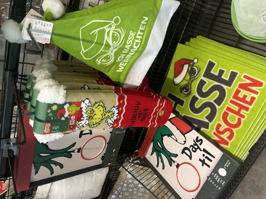 This image depicts a retail display of "The Grinch"-themed Christmas merchandise inside a store located in Kehl, Germany
