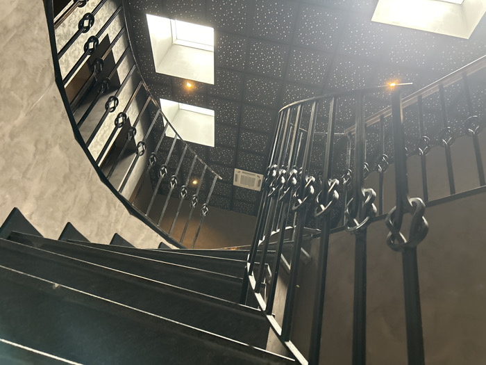 An upward-angled view captures a dark, possibly metal, spiral staircase within an interior structure in Bansko, Bulgaria