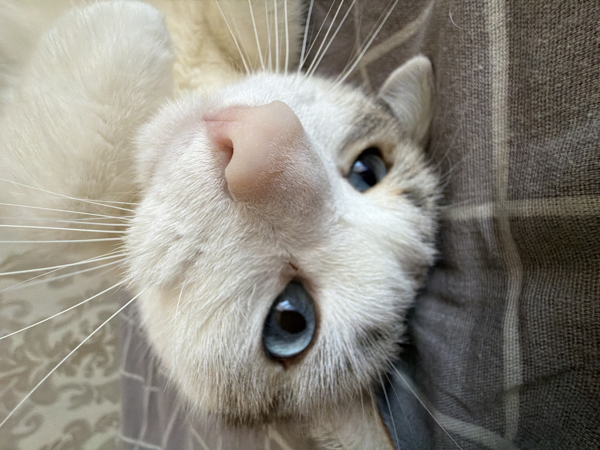 - "The image displays a close-up, inverted perspective of a domestic cat's head" by FM-Ecg5G3, licensed under CC BY 4.0