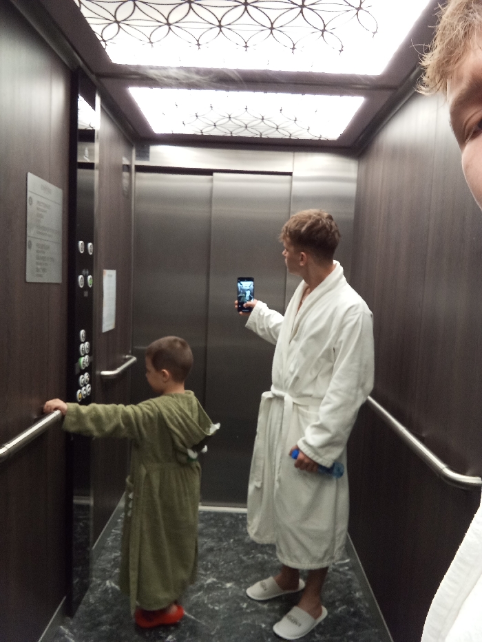 This image captures the interior of an elevator, located in Hisarya, Bulgaria. The elevator features dark wood-paneled side walls, stainless steel doors at the far end, and a dark, reflective floor with a light-colored, possibly marbled, pattern. The ceiling incorporates a large, rectangular illuminated panel with a white geometric pattern resembling interconnected circles. Three individuals are present. On the far right of the frame, the photographer's right eye, forehead, and part of a white terrycloth bathrobe are visible. Center-right, an adult male stands with his back partially to the viewer, facing the elevator doors. He has short, light brown hair and is dressed in a white terrycloth bathrobe, tied at the waist, and white open-toed slippers, one of which visibly displays the word "REGENA." He holds a black smartphone horizontally in his right hand, pointed towards the elevator doors, appearing to record or photograph the scene or reflection. In his left hand, he holds a blue plastic water bottle. To the adult's left and slightly closer to the viewer, a child stands facing the elevator control panel and doors. The child has short, dark brown hair and wears an olive green hooded terrycloth bathrobe, which features a white, possibly cartoon-like, decorative element on the back resembling a tail. The child wears red clogs or sandals. The child's right hand rests on a silver horizontal handrail affixed to the left wall of the elevator. The elevator control panel, mounted on the left wall, contains multiple push buttons and a digital display. A white information sheet is affixed to the wall below the control panel.