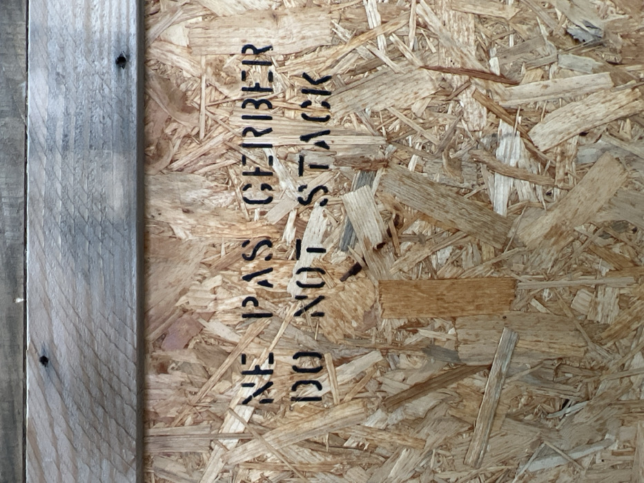 A close-up image depicts a section of a shipping container or panel in Aulnay-sous-Bois, France. The primary subject is an Oriented Strand Board (OSB) panel, characterized by its surface composed of compressed, irregularly oriented wood strands in various shades of light brown and tan. Above the OSB panel, a horizontal, weathered wooden plank, exhibiting a grey-brown hue and visible grain, spans the upper portion of the frame. Two dark circular indentations, consistent with nail or screw heads, are present in the plank. Stenciled in black capital letters across the OSB panel are the phrases "NE PAS GERBER" and, directly beneath it, "DO NOT STACK". No individuals are visible. The scene appears to be an interior or sheltered environment, typical of a warehouse, storage facility, or industrial setting.
