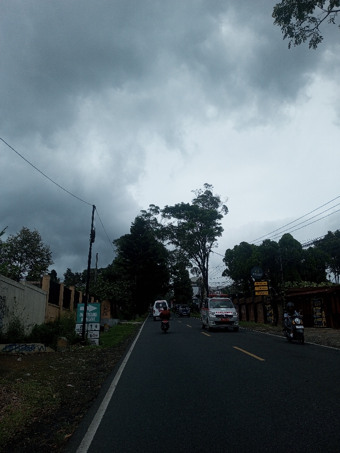 The image displays a road scene in Ariyalai East, Sri Lanka, captured under an overcast sky dominated by heavy grey clouds. The dark asphalt road runs from the foreground into the distance, marked by a solid white line on its left edge and double broken yellow lines in the center. In the foreground on the right, a dark-colored scooter/moped is visible, operated by an individual wearing a helmet, moving towards the camera. Mid-ground, a light-colored ambulance, featuring red markings and emergency lights on its roof, travels away from the camera; the word "AMBULANS" is visible in reverse on its front. A red motorcycle, also moving away from the camera, is positioned behind and to the left of the ambulance. Further in the background on the left, a second white ambulance is discernible, also traveling away from the viewer. The left side of the road is bordered by a light-colored concrete wall displaying graffiti. A black utility pole stands near the wall, supporting a prominent black power line that spans horizontally across the upper left quadrant of the image. Adjacent to the pole is a green and white sign with partial text reading "ARJANG MANGOK," accompanied by smaller pictographic signs. Behind the wall and signs, dense green trees and foliage are present. On the right side of the road, a dark, textured wall or fence runs parallel to the roadway. Numerous trees with dark green canopies line this side, some reaching considerable height. Overhead utility lines are also visible along the right side. The overall lighting conditions suggest a low-light environment, consistent with heavy cloud cover.