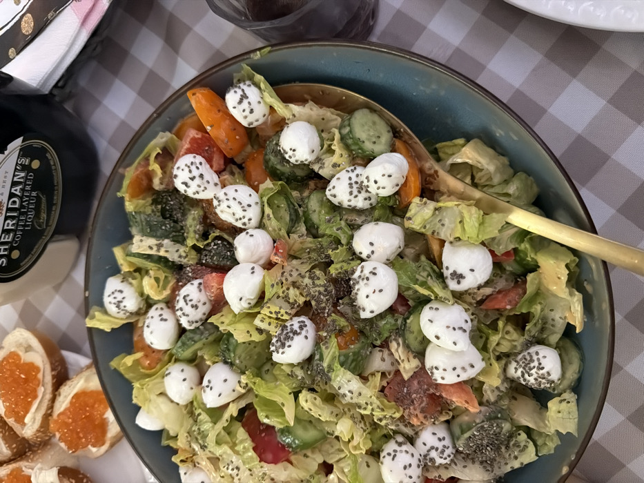 The image displays a dining table setting in Nahariyya, Israel, covered with a light grey and white checkered tablecloth. A prominent teal ceramic bowl in the center-right contains a mixed green salad composed of lettuce, sliced cucumbers, chopped red and orange tomatoes, numerous small white mozzarella balls, and a generous coating of chia seeds. A golden-colored serving spoon is partially submerged within the salad. To the upper left, several pieces of toasted bread, likely baguette, are topped with a white spread and bright orange fish roe, resting on a white plate. In the upper right background, a bottle of Sheridan's Coffee Layered Liqueur is visible alongside a partially obscured dark-colored bottle. A dark glass containing a dark liquid and a portion of a white plate are visible in the lower right. A pink and gold polka dot patterned item, possibly a napkin or wrapper, is also partially visible in the upper right. No individuals are present in the scene.
