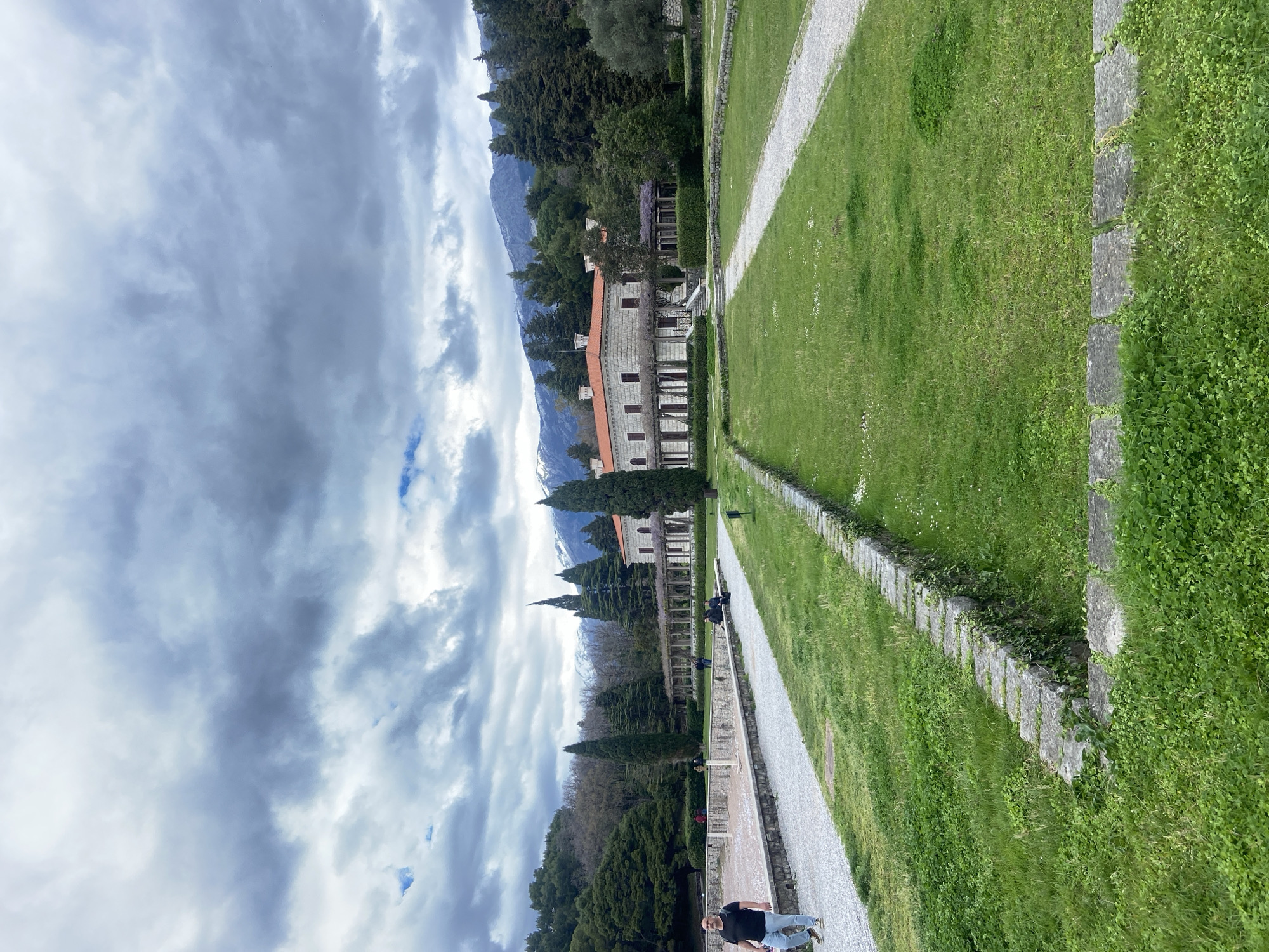The image depicts a view within the Villa Miločer grounds, situated in Sveti Stefan, Montenegro. The Villa itself is visible, featuring a stone façade and a red-tiled roof. Lush green grass flanks a central gravel pathway. Stone borders the pathway. A person is seen walking near the edge of the pathway. The sky is overcast with heavy clouds. Mountains are visible in the background. Trees and other greenery surround the Villa.