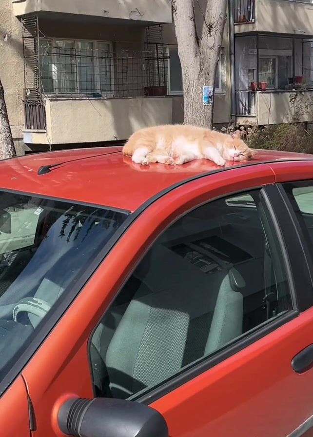 n orange and white cat lying on the roof of a red car. The car is parked on a street next to a sidewalk and apartment buildings. The cat is initially shown lying with its eyes closed, then it begins to groom itself by licking its fur. The video zooms in on the cat. The weather appears to be sunny.