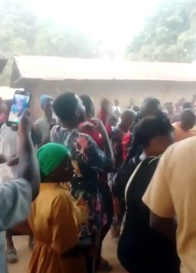 large crowd of people. Most individuals are wearing brightly colored clothing. Some people are raising their arms. The crowd is densely packed together. The background includes a white building, trees, and a hazy sky. The video is shaky and appears to have been taken from within the crowd.