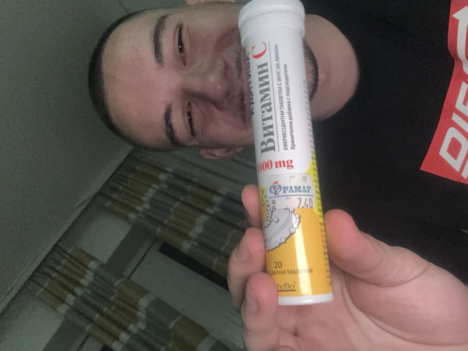 This image presents a close-up, indoor portrait of a male individual smiling at the camera, holding a tube of effervescent tablets in his left hand. The male has short, dark hair and wears a dark t-shirt with a partially visible red and white logo. The cylindrical white and yellow tube is labeled in Cyrillic, clearly displaying "Витамин C" (Vitamin C), "1000 mg," "Ефервесцентни таблетки с вкус на лимон" (Effervescent tablets with lemon flavor), and "20" (likely tablets). The brand "ФРАМАР" (FRAMAR) is also visible. A price sticker on the tube shows "7.40 лв," indicating Bulgarian Lev. The background reveals striped curtains, alternating in grey and light beige/yellow, covering a window, with a ceiling visible above. The lighting within the scene is dim. While the location is specified as Krems an der Donau, Austria, the evidence within the image, specifically the product's Cyrillic labeling and Bulgarian currency, does not corroborate this location and instead suggests a Bulgarian context.