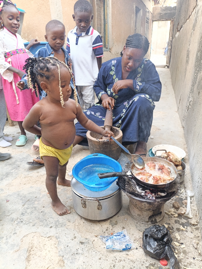 In an outdoor, unpaved alleyway or courtyard within Gwagwarwa, Nigeria, a scene of domestic activity unfolds involving one adult female and five children. The adult, clad in a dark blue dress with light green embroidery, squats on the right side of the frame, actively using a wooden mortar and pestle. Directly in front of her, a black frying pan containing pieces of chicken frying in oil rests on a charcoal stove, emitting smoke and flames. A large metal spoon is present in the pan. Adjacent to the frying pan is a smaller silver pot holding additional chicken pieces. To the left of the stove setup, a blue plastic colander sits atop a large, lidded silver pot. In the immediate foreground, a barefoot toddler, stripped to yellow briefs, with elaborate braided hair, stands observing and reaching towards the cooking area with one hand. To the left, a young girl in a white and pink dress smiles, looking towards the toddler. Two young boys stand further back, observing: one in a blue top and another in a white polo shirt with red and blue stripes. A fifth child's leg is partially visible on the far left. The ground is a mixture of light-colored concrete and dirt, with scattered debris including a crumpled plastic water sachet and a black plastic bag with a red cap near the cooking station. The background features aged, light-colored walls, possibly mud or unpainted concrete, defining the narrow passage. An open doorway in the rear wall reveals a glimpse into another part of the structure or alley.
