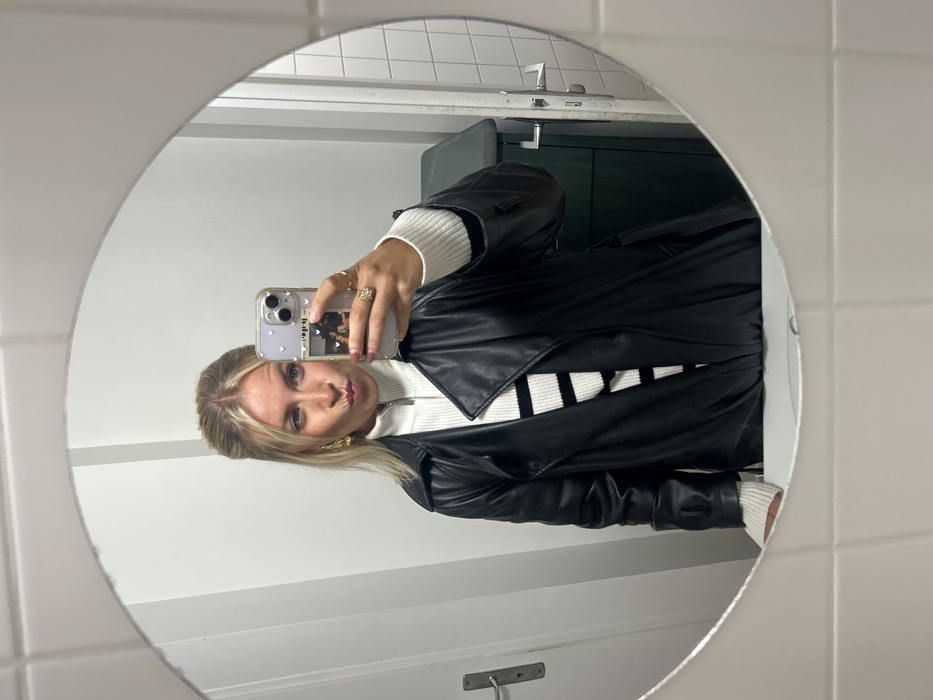 A person poses in a round mirror selfie, holding a phone with a lilac case. She wears a white turtleneck sweater with black stripes and a black leather jacket. The background reveals a tiled wall and sink area, possibly a bathroom. Her blonde hair is partially up. She is wearing gold earrings and rings.