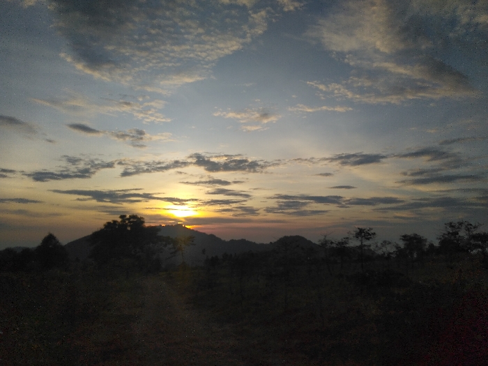 This image depicts a natural landscape at either sunrise or sunset, situated in Trondheim, Norway. The sky, occupying approximately the upper two-thirds of the frame, features a low-lying sun near the center-right horizon, radiating strong yellow and orange light. Scattered cumulus clouds are present across the sky, displaying a range of grey, white, and warm hues where illuminated by the sun, against a pale blue-grey upper atmosphere. The horizon is defined by a dark silhouette of multiple rolling hills or mountains. In the midground, a dense line of trees forms a dark, irregular silhouette against the brighter sky, with individual tree crowns discernible. The foreground, occupying the lower third of the image, consists of dark, uneven ground covered with sparse, low-lying vegetation. A faint, lighter-toned path or clearing appears to traverse the lower-center foreground. No individuals, man-made structures, or specific activities are visible.