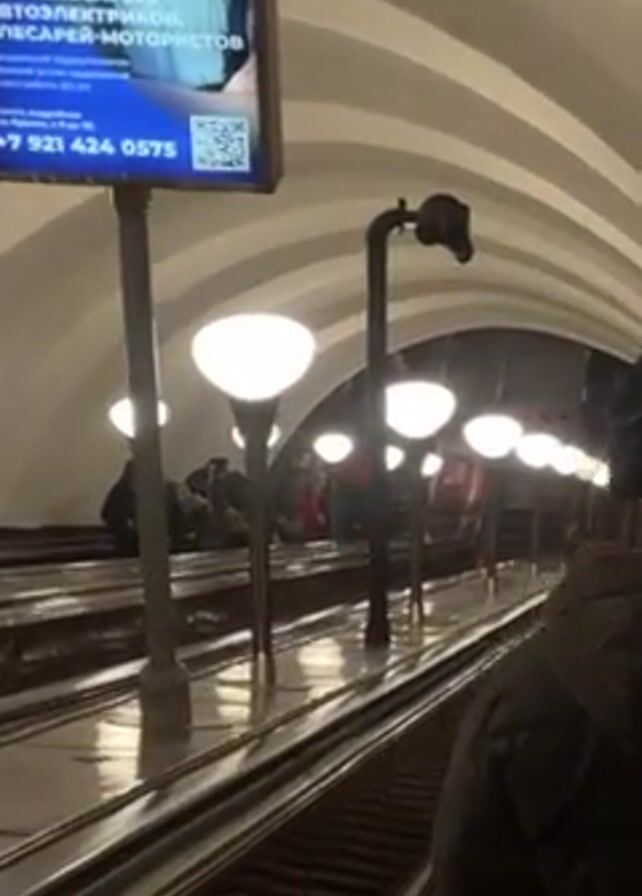 view from an escalator going down in what appears to be a subway station. The escalator has chrome treads and the station has an arched ceiling with recessed lighting and rows of globe-shaped lamps on posts alongside the escalator. People are on the escalator ahead. An advertisement for auto mechanics is posted to the left, with a phone number and QR code displayed. The camera is held by a person on the escalator and someone's head and shoulder appears in the right side of the frame. A security camera is visible among the lamps.