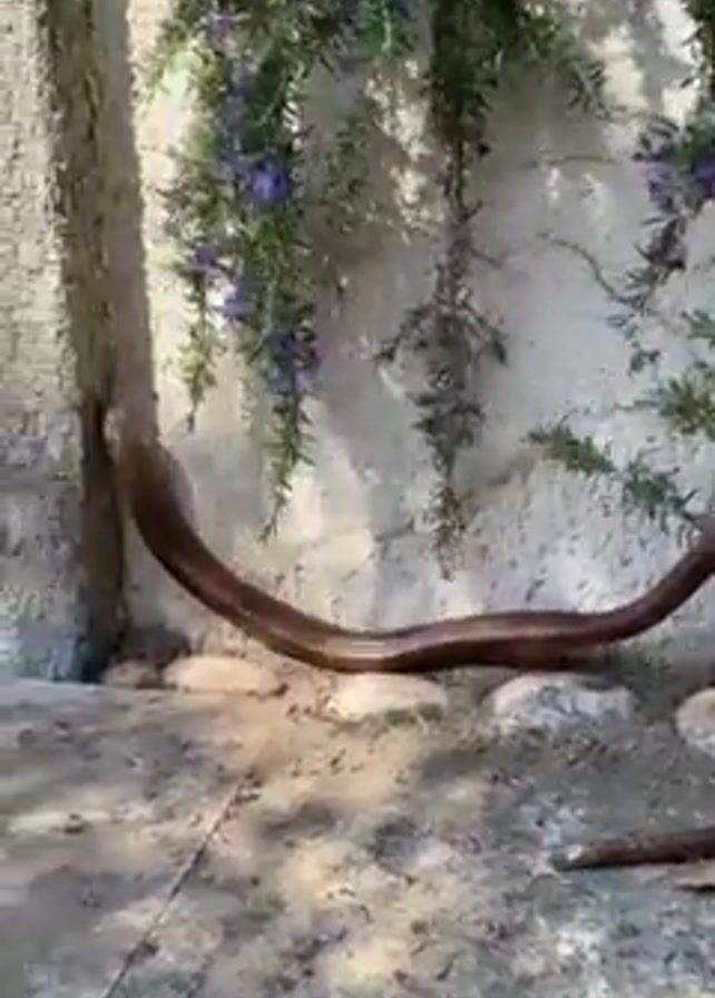 large brown snake moving on a concrete surface. The snake is partially hidden behind greenery, which includes purple flowers. The snake is seen moving around the greenery, slithering across the concrete surface. The video is taken outdoors, with natural lighting.