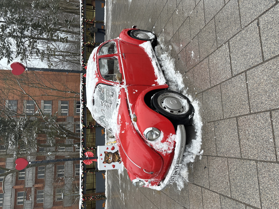 - "A red Volkswagen Beetle, vintage model, is centrally positioned on a grey paver surface in Zelenogradsk, Russia, partially covered by fresh snow" by FM-ARrGE2, licensed under CC BY 4.0