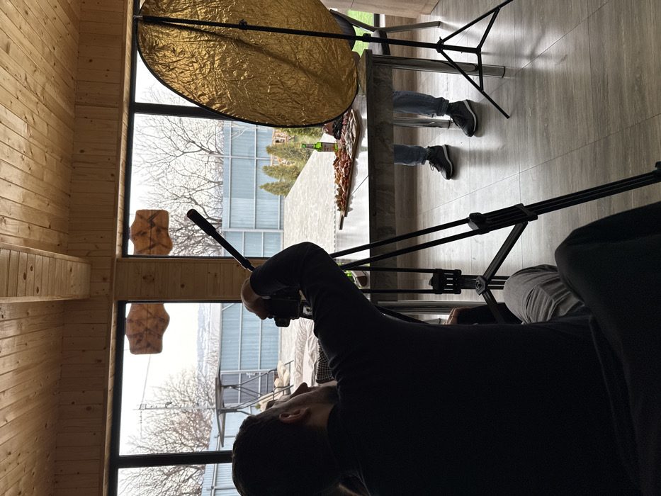 The image displays an indoor setting, identified as a building in Voskevaz, Armenia, where a food photography session is underway. In the immediate foreground, a male individual, observed from behind and the left profile, is crouched or kneeling. He wears a dark long-sleeved shirt and light grey trousers, operating a black camera mounted on a black tripod. The camera is aimed towards a rectangular table positioned centrally in the frame. On the table, a wooden platter is laden with numerous skewers of cooked meat and other food items. A green glass bottle rests beside the platter. To the right of the table, a large, circular gold photographic reflector is positioned on a stand, directing light towards the food display. The lower legs and feet of a second individual, dressed in blue jeans and dark sneakers, are visible standing behind the table, partially obscured by the table and the reflector stand. The interior features a light-colored tiled floor and a wooden plank ceiling with visible wooden support beams. Large, floor-to-ceiling windows constitute the background, offering a view of an outdoor environment. Outside the windows, a light blue corrugated metal fence is present. Beyond the fence, bare deciduous trees and distant hills or mountains are visible under an overcast sky. Closer to the building, several evergreen shrubs are discernible. Two geometric, light brown decorative fixtures are mounted on the wooden ceiling section above the windows. An outdoor swing set is partially visible through the left window.
