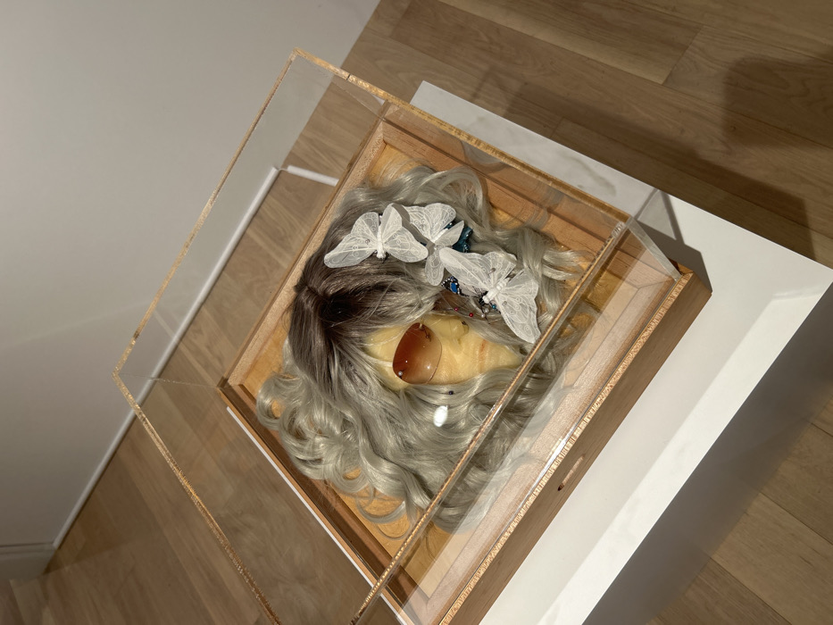 A surreal art piece features a wig with gray and brown hair, adorned with white and blue butterflies, displayed within a wooden-framed box. A smooth, amber-colored stone rests on the wig's forehead. The box is encased in a transparent acrylic container, adding a layer of visual complexity. The artwork sits atop a white pedestal, positioned at an angle on a wooden floor against a white wall. The overall effect is dreamlike and evocative.