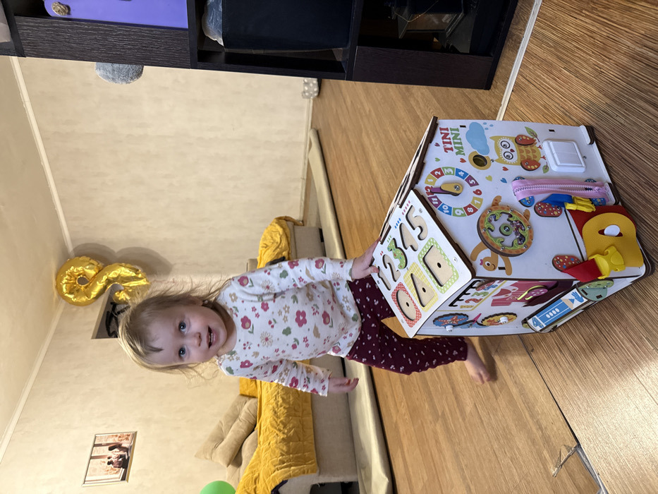 A young child, barefoot, stands on a light brown laminate floor in a residential interior in Bol'shie Mkhi, Russia. The child, wearing a white long-sleeved shirt with floral patterns and dark red polka-dotted pants, faces forward with a smiling expression. Their right hand rests on the top surface of a white wooden activity house, labeled "TINI MINI," positioned in the foreground. This activity house features a sloped roof with number cutouts and shape sorters, and its visible side displays a clock face, an owl illustration, a light switch, a zipper, and other interactive elements. In the background, a light-colored sofa with a yellow quilted throw is visible. A framed picture hangs on the light-colored wall, which also displays a large gold foil balloon shaped like the number "8." A dark brown shelving unit stands on the right, containing miscellaneous items. A rolled-up light-colored rug lies on the floor behind the child.
