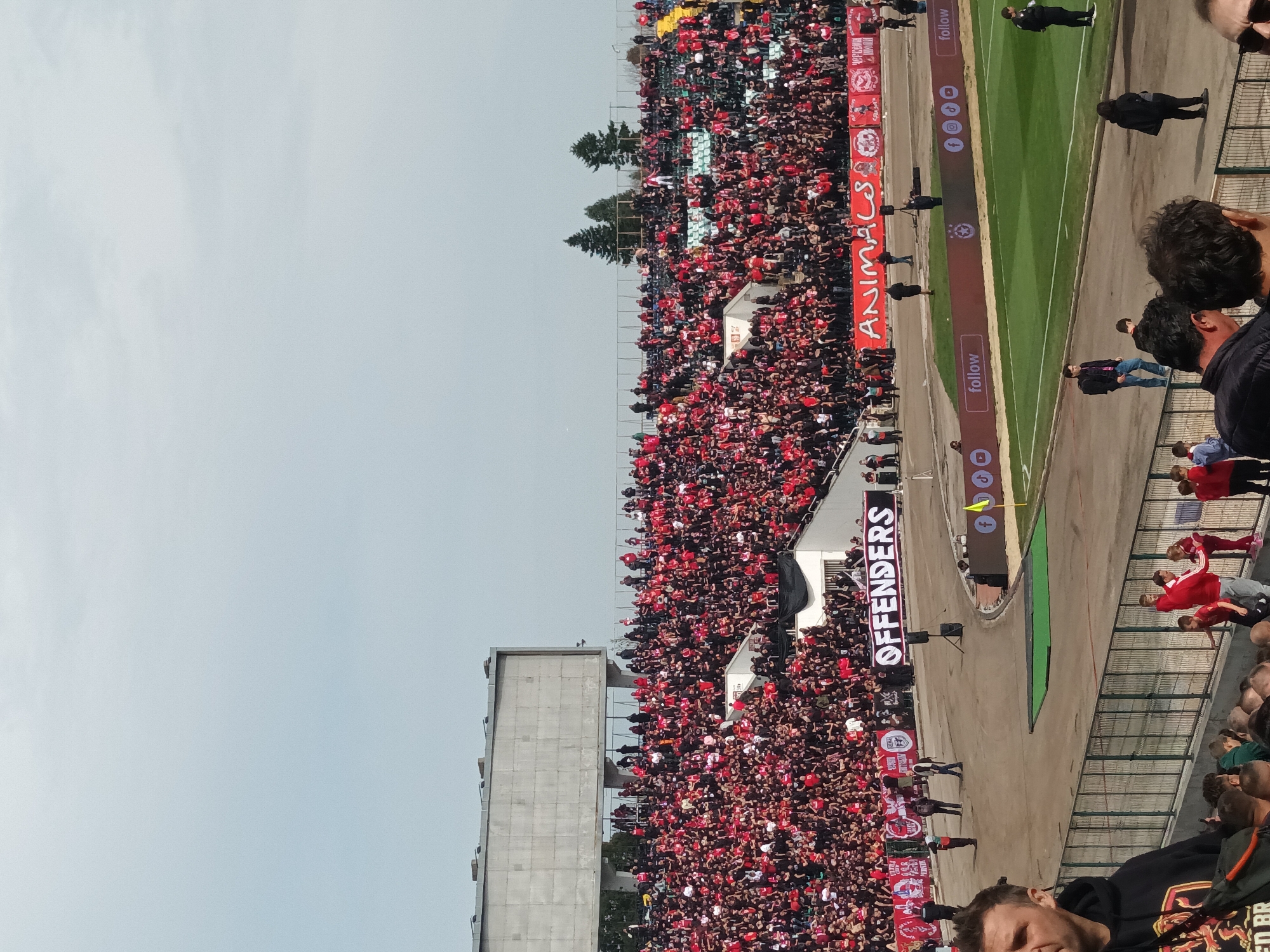 crowded stadium in Sofia, Bulgaria, likely during a sporting event, possibly soccer. The stadium is filled with spectators, most wearing red clothing. A large sign reading "OFFENDERS" is visible. A tall concrete structure stands adjacent to the stands. A track surrounds the playing field, with advertising boards displaying social media icons and the word "follow". Green grass is visible on the playing field. People can be seen walking along the track and standing near the edge of the stands. The sky is overcast.