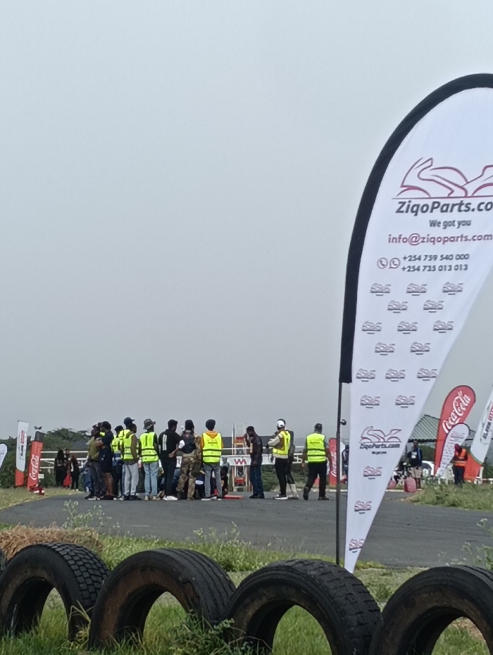The image captures an outdoor scene at a paved track in Matathani ward, Kenya, under an overcast sky. In the immediate foreground, three dark, worn vehicle tires are partially embedded in grassy terrain. Beyond the tires, a dark paved track runs from left to right, curving slightly. A group of approximately 15 to 20 individuals is gathered on and beside the track in the midground. A majority of these individuals are wearing bright yellow high-visibility vests over their clothing. They appear to be standing in clusters, facing various directions, some seemingly observing activity further down the track or interacting within their groups. One individual on the right side of the group, also in a yellow vest, is walking away from the main cluster. To the right, a prominent teardrop-shaped banner with a black border dominates the foreground. It is white with a black logo depicting two rabbits and the text "ZiqoParts.com," "We got you," "info@ziqoparts.com," and two contact phone numbers (+254 739 540 000 and +254 735 013 013). Additional banners, including a red Coca-Cola banner and other advertising signage, are visible along the track's edge in the mid-background. The background consists of distant trees, indicating an open-air environment.