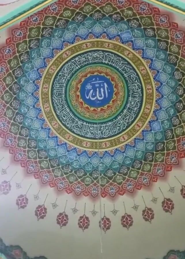 The video presents an interior view of what appears to be a mosque, focusing predominantly on the elaborately decorated dome and walls. The camera starts pointed directly at the dome, which features a circular design with a central inscription "Allah" in blue Arabic calligraphy, surrounded by concentric layers of intricate patterns in various colors including blue, green, red, and gold. The dome's design is further enhanced with repeating floral motifs around its perimeter. The camera gradually pans down to reveal the walls, which are adorned with arched windows, decorative columns, and calligraphic designs along the upper sections. The general color scheme of the interior is a blend of cream, green, and accented shades, creating a visually rich and sacred space.