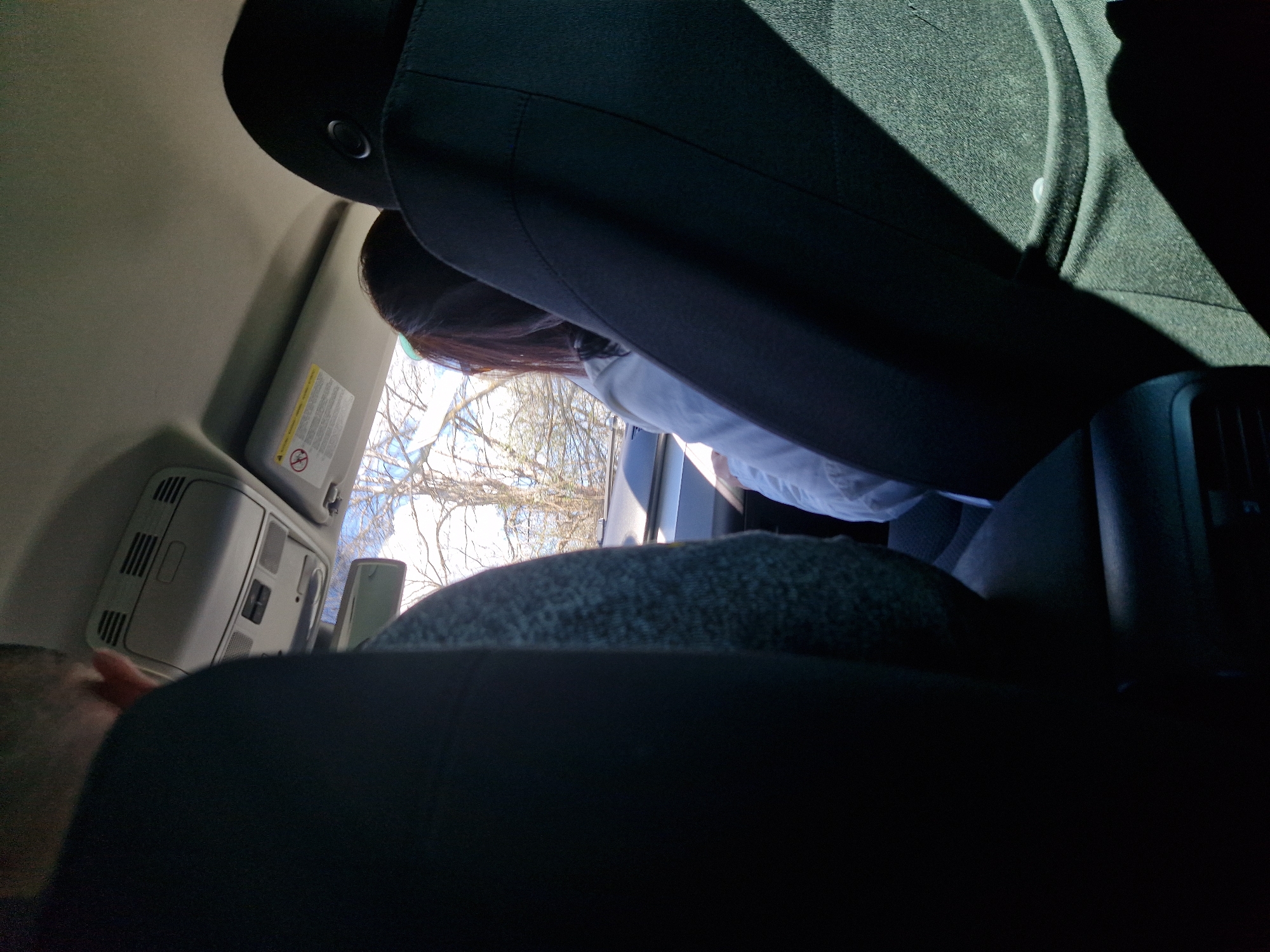 - "A person with brown hair and a white shirt is seated inside a car, possibly in the backseat" by FM-JBLtz2, licensed under CC BY 4.0
