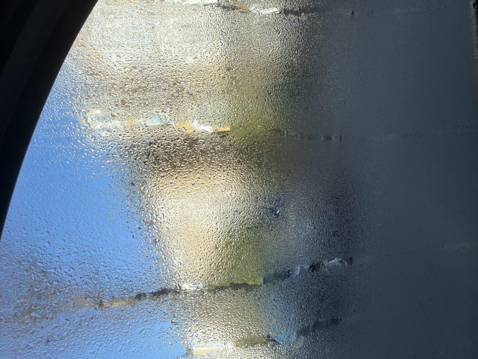 The image captures an exterior scene viewed through a heavily condensed glass window, likely a vehicle window, in the city of London, United Kingdom. The entire glass surface is covered in numerous small, distinct water droplets, with some vertical streaks indicating gravity's effect on the condensation. A dark, curved frame element is visible in the top right corner. Beyond the obscured glass, a bright, clear blue sky occupies the upper portion of the frame. Below the sky, diffused, light-colored architectural structures, possibly beige or yellow buildings, are visible as blurry shapes. Green vegetation, appearing as indistinct foliage, is present in the middle ground, particularly towards the left. The lower third of the scene is darker and indistinct, suggesting a ground or road surface. No specific individuals or identifiable objects, such as vehicles, are clearly discernible due to the significant visual obstruction caused by the condensation, though faint, blurred shapes might suggest distant urban elements. The environment appears to be an urban or suburban setting during daylight hours. No specific actions or interactions are visible.