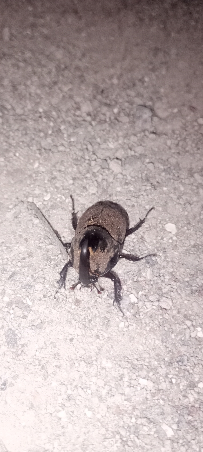 A large beetle with a prominent horn is centered on a gray, grainy surface. The beetle's body is dark, with a textured, brownish upper shell. Six legs extend outwards, and antennae are visible near the head. The lighting appears dim, possibly nighttime, casting shadows and emphasizing the rough texture of the surface it's on. The beetle's horn curves upwards, suggesting a male rhinoceros beetle.