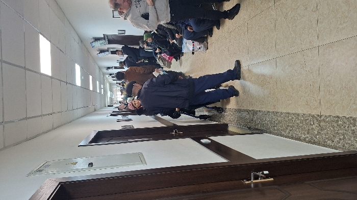 A waiting area is crowded with seated people. There is a stroller in the middle of the room, and other people are standing. The floor is made of tiles, and the walls are lined with doors. There are fluorescent lights in the ceiling. The space appears to be a waiting room in a medical facility or government office.