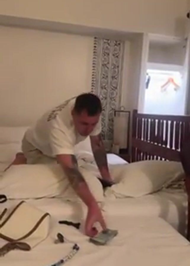 A person kneels on a bed and picks up money. The person is wearing a white t-shirt and light-colored shorts. The person has tattoos on their left arm. The bed is white. On the bed are pillows, a tan purse, a blue lanyard, and what appears to be a pacifier. The bedroom has white walls and a wardrobe.