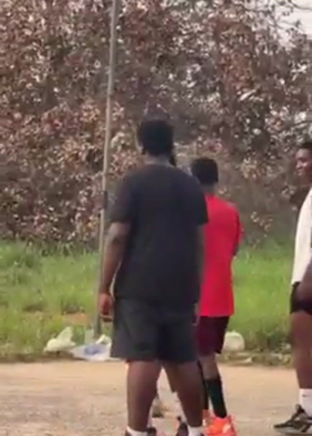 The scene captures a group of young men engaged in a basketball game on an outdoor court. Two of the men are actively involved in a shooting drill near the hoop, while a third, dressed in a black shirt and shorts, observes them. The court is made of grey concrete and has faded boundary lines. Behind the players, a line of trees with reddish-brown foliage creates a natural backdrop. The sky appears overcast, indicating a cloudy or potentially rainy day.