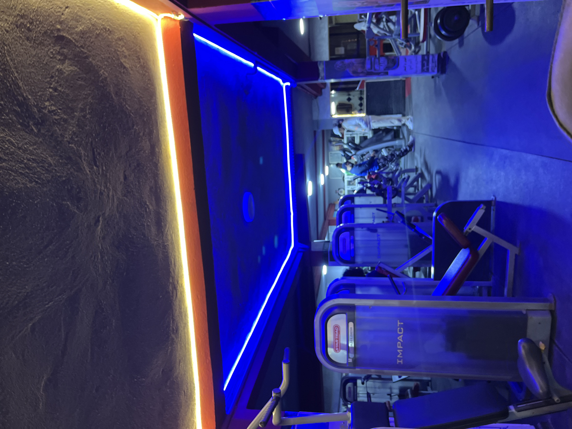 The image depicts the interior of a gym. Several pieces of exercise equipment are visible, including weight machines. People can be seen working out in the background. The lighting is a mix of blue and yellow neon, creating a modern atmosphere. The walls have a textured finish. Based on the location information, this is likely a gym in Fez, Morocco.