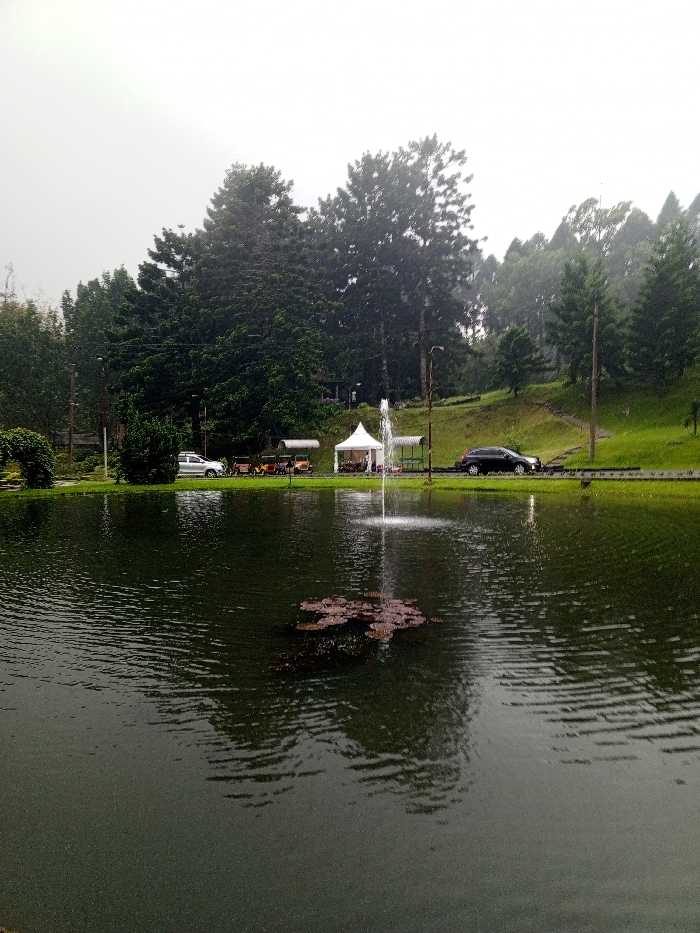 A serene pond reflects the surrounding environment. Water ripples disrupt the dark surface, where a cluster of lily pads floats in the center. A fountain shoots water up into the air. Along the pond's edge, a white SUV, small golf carts, a white tent, and a black car are visible. Lush green trees and a grassy slope form the backdrop, fading into a misty sky.