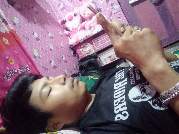A male individual is depicted lying supine in a bedroom in Cipinang, Indonesia. His eyes are closed. He wears a black t-shirt featuring a reversed white graphic that includes the text "LES RIDERS" and a skull design with goggles. His right hand, adorned with rings on the index and ring fingers, holds a light-colored smartphone with the screen oriented away from the viewer. A silver-colored bracelet is present on his left wrist. The room's environment is characterized by pink fabric walls or curtains, patterned with white Hello Kitty characters and stars. A green pillow or sheet supports his head. Above him, a shelf holds two pink stuffed animals, a black portable speaker, and a pink multi-compartment tray.