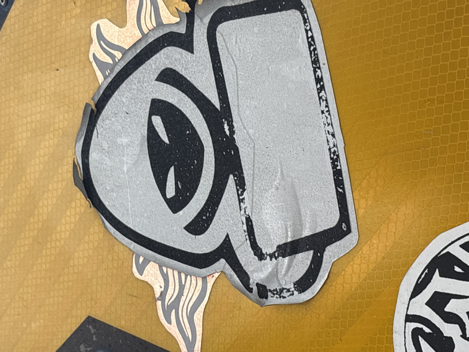 A weathered sticker featuring a stylized cartoon eye on the left and a rectangular shape on the right is adhered to a textured yellow surface
