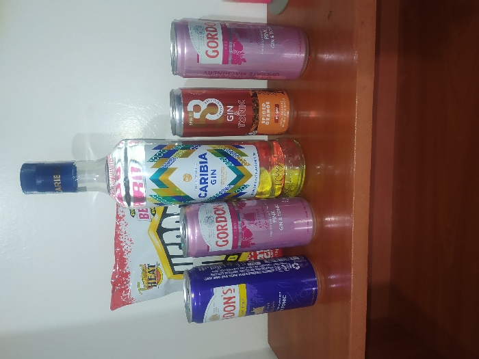 The scene is set in Thika Township ward, Kenya. A collection of alcoholic beverages and a snack bag are arranged on a brown wooden surface, likely a shelf or table, against a plain white wall. The central item is a clear glass bottle of Caribia Gin with a blue cap and a multi-colored label. To its left, from left to right, are one purple Gordon's Gin & Tonic can and one pink Gordon's Pink Gin & Tonic can. To the right of the Caribia Gin bottle, from left to right, are one red-orange Spirit 3 Spiced Orange Gin Tonic can and another pink Gordon's Pink Gin & Tonic can. Partially visible behind the Caribia Gin bottle and the two leftmost cans is a white bag of Tropical Heat crisps or snacks, bearing the text "TROPICAL HEAT" and "BEANS." No individuals are present in the image.