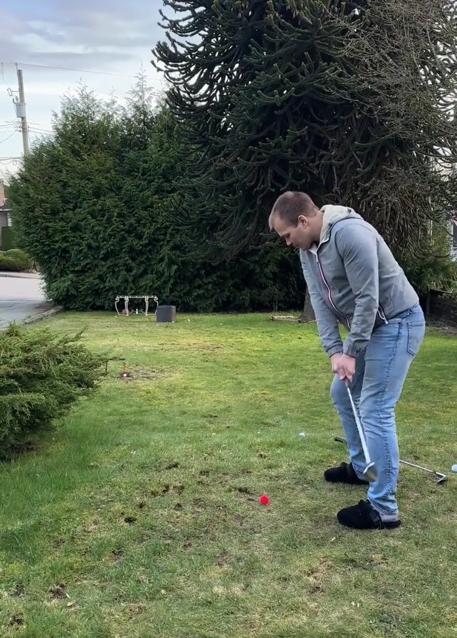 A man is playing golf in his front yard