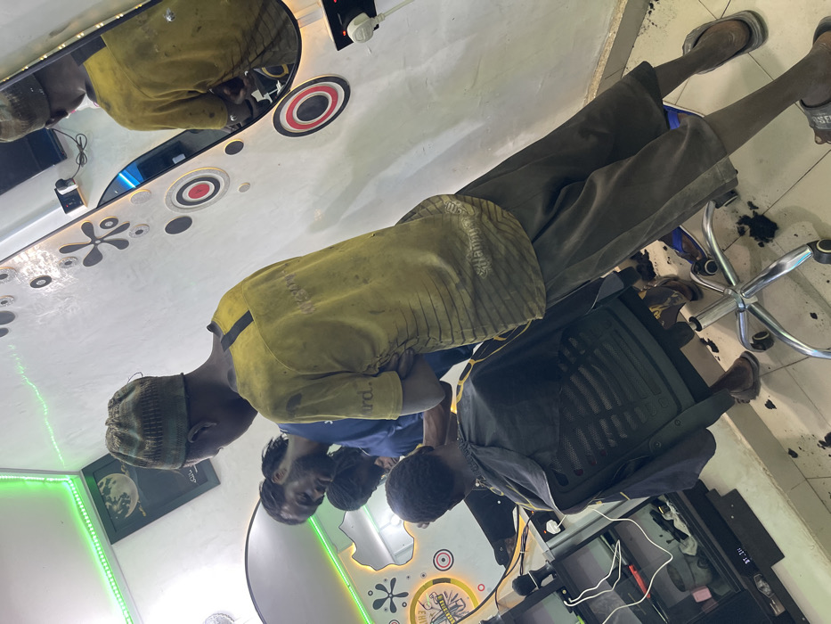 The image depicts an indoor scene within a barbershop located in Unguwar Gabas, Nigeria
