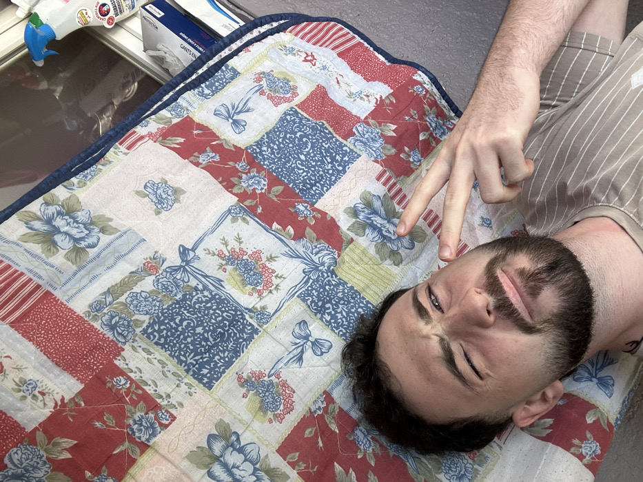 - "The image displays a close-up, high-angle view of a male individual lying on a patchwork quilt in an indoor setting within Strasbourg, France" by FM-xEJxd2, licensed under CC BY 4.0