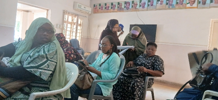An indoor room in Unguwan Sanusi, Nigeria, is depicted with light-colored walls. A frieze of approximately twelve framed portraits of men is mounted on the upper wall. A wall-mounted air conditioning unit is visible on the upper left, and a flat-screen television is mounted on the upper right wall. Windows with a grid pattern are present on the left side, admitting natural light. At least seven individuals, predominantly women of African descent, are present. Most are seated in plastic chairs. In the foreground left, a woman wearing a light green hijab, glasses, and a green and white patterned dress over dark sleeves sits in a white chair, looking towards the right side of the frame. To her right, another woman with braided hair, glasses, a light blue top, and blue jeans is seated in a gray chair, operating a black smartphone. A brown handbag rests on her lap. In the mid-ground, a woman in a dark brown hijab and dress stands, leaning forward, focused on an object or document on a white surface, largely obscured. Adjacent to her, a partially visible woman in an olive-green hijab also looks down at the white surface, holding a document. To their right, a woman in a black and white floral dress is seated in a dark gray chair, looking down at her hands, which are near a black handbag. A partially visible person wearing a blue garment is seated on the far right, next to a black bag. The overall scene suggests a gathering, possibly a meeting or workshop.